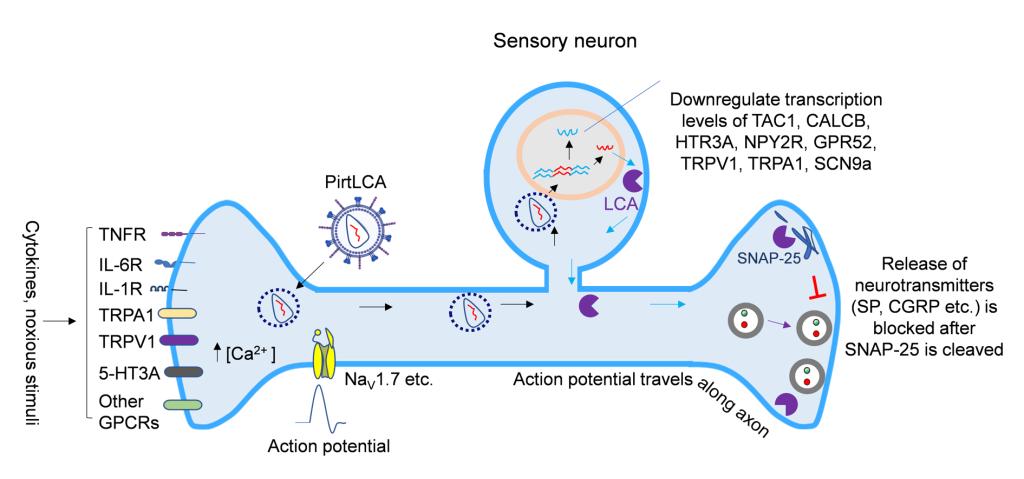 本研究中心以慢病毒为药物递送载体,利用Pirt蛋白(Phosphoinositide-interacting regulator of TRP)在伤害性感觉神经表达的特异性,首次克隆并鉴定了人源Pirt功能性启动子,并制备了一种经Pirt启动子介导表达的、可降解t-SNARE(SNAP-25)的蛋白酶(LCA)的新型病毒载体药物(PirtLCA),此载体药物可特异性抑制背根神经节和三叉神经节神经元中SNAP-25的功能,不仅可以长效抑制痛觉神经肽的合成和释放而且可以降低炎性状态下离子通道和痛觉受体基因的转录。工程化PirtLCA病毒载体药物可为长期缓解慢性疼痛提供一种新的治疗手段。