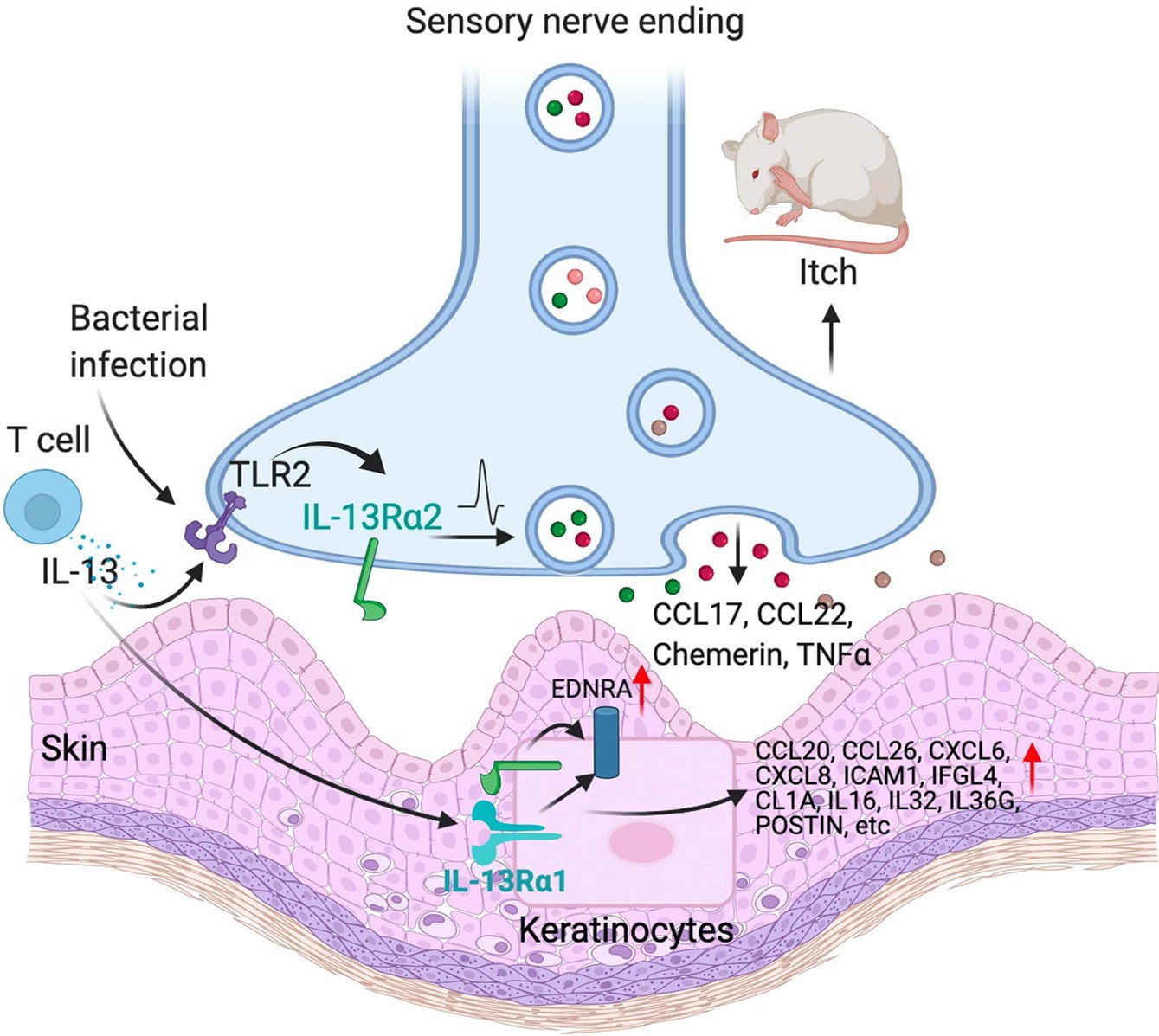 在课题研究中,作者发现AD 疾病中上调的IL-13通过IL-13Rα1 增加角质细胞中IL-13Rα2 的转录,而IL-13Rα2 敲低可降低EDNRA, CCL20, CCL26 等痒受体和炎性因子的转录水平;在感觉神经元中,TLR2 的激活可通过调节IL-13Rα2,促进CCL17, CCL22, Chemerin, TNFa 等与AD及皮损相关因子的表达。文章详细阐述了IL-13Rα2 在皮肤-神经免疫中的重要作用和分子机制,为慢性痒和神经性炎症的治疗提供了新靶标。