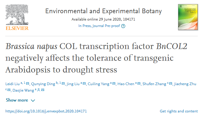 2020年6月29日,欧博abg官方网站/省部共建作物逆境适应与改良国家重点实验室王道杰课题组在Environmental and Experimental Botany 在线发表题为“Brassica napus COL transcription factor BnCOL2 negatively affects the tolerance of transgenic Arabidopsis to drought stress”的研究论文。本研究通过对油菜FOX拟南芥库进行筛选与鉴定,得到干旱响应关键基因BnCONSTANS-LIKE2(BnCOL2),进而揭示BnCOL2可能通过影响ABA信号通路及干旱胁迫相关基因的表达负调控植物对干旱胁迫的耐受性。