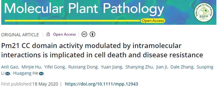 2020年5月18日,来自于欧博abg官方网站与江苏大学的研究团队合作在SCI期刊《Molecular Plant Pathology》上在线发表了题为“Pm21 CC domain activity modulated by intramolecular interactions is implicated in cell death and disease resistance”的论文。该论文报道了小麦白粉病抗性蛋白Pm21 CC结构域的诱导细胞死亡活性受分子内不同结构域互作调节,鉴定了CC结构域中对细胞死亡、蛋白自激活和白粉病抗性具有重要作用的氨基酸位点,提出了Pm21调节的细胞死亡途径与白粉病抗性途径可能是两种独立的信号途径。