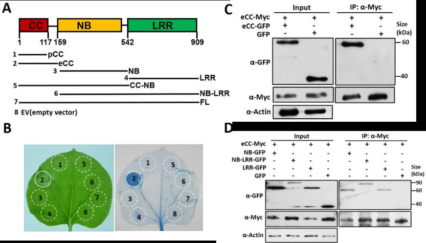 在这篇论文中,研究人员发现在烟草中过表达Pm21的CC结构域能够诱导细胞死亡,而其他结构域以及含有CC的CC-NB、全长Pm21蛋白都不能诱导细胞死亡,表明CC结构域具有诱导细胞死亡的活性;全长Pm21蛋白在没有病原菌诱导时处于失活状态。作者进一步通过免疫共沉淀方法检测到CC结构域可以在体内自身互作,形成同源聚体。CC也可以NB和LRR结构域互作,而且NB和LRR也可以相互作用。作者认为,这种分子内不同结构域的互作抑制了CC的活性。作者还鉴定了Pm21蛋白的自激活位点D491,该位点突变后,Pm21蛋白变为组成型激活状态。而且,D491V调节的自激活依赖LRR结构域的参与。