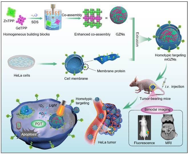 该论文针对目前光动力治疗中的纳米光敏剂的制备效率低及功能拓展困难的问题展开研究,发展了一种新型高效的共组装方法,解决传统自组装制备卟啉基纳米光敏剂存在的低产量和单一功能缺点。通过对组装模块分子单元的官能团、比例和反应条件进行优化,大大提高了纳米组装体的产量(5倍);同时实现了钆卟啉的MRI成像功能和四吡啶基锌卟啉高效产生单线态氧功能的有效集成整合。结合纳米光敏剂合适的尺寸及表面优势,采用同源靶向肿瘤细胞膜的修饰,赋予所得纳米复合物免疫逃逸的特性,大大提高了纳米材料在肿瘤区域的富集,最终增强肿瘤的内吞效率和高效的MRI/荧光双模态成像介导的肿瘤光动力治疗效率。