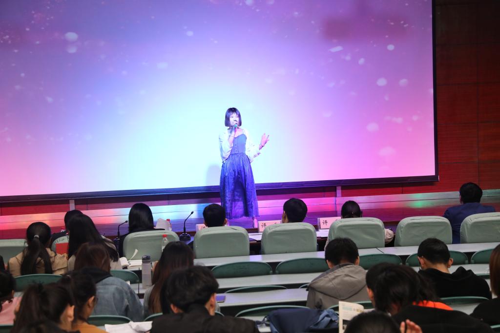 经过初赛和半决赛的精彩角逐,共有八名选手脱颖而出,进入决赛。本次决赛分为命题演讲和评委提问两个环节。命题演讲的题目为“the change”,参赛选手准备充分,信心十足,用流利的英语口语和精美的PPT阐述了自己眼中的“the change”,为场下师生带来了一场英语视听盛宴。在比赛的间隙,邓欣雨等同学带来了英文版的《出师表》,铿锵有力的语言,让人身临其境,展现了时代的变化,与决赛主题联系在一起;刘学颖同学演唱了动听的英文歌曲《better than revenge》,优美、动听的旋律,将现场的氛围推向高潮。经过一个半小时的激烈角逐,最终沈泽纯同学摘得桂冠。