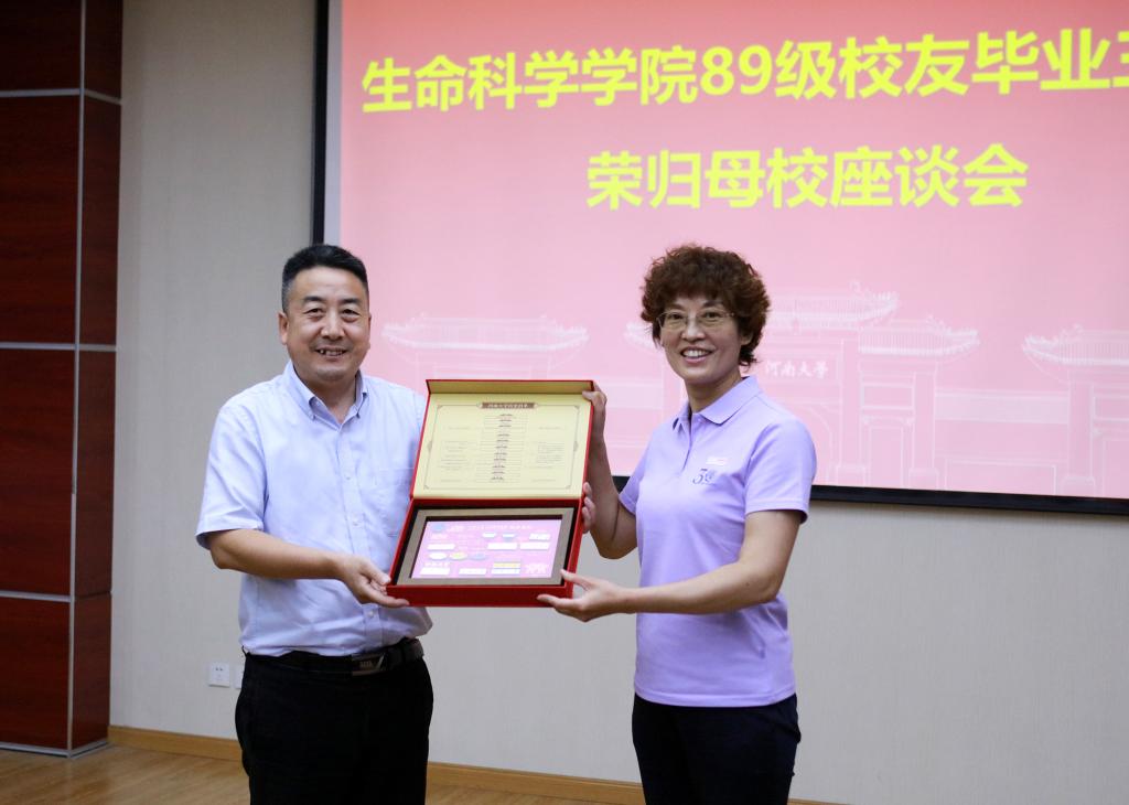 89级校友向学院捐赠纪念汴绣,祝愿学院勇攀高峰,取得更大成就。吴建伟代表学院向89级校友送上欧博abg官方网站校徽套装,寄托了母校对大家诚挚的祝福。