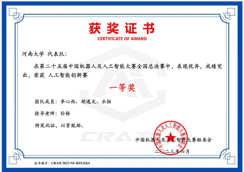 近日,由中国人工智能学会主办的第二十五届中国机器人及人工智能大赛全国总决赛圆满闭幕。来自全国300多所高校共800多支队伍参加了本次比赛,展示了前沿的机器人、人工智能技术,在线上线下展开对决。经过激烈角逐,我院团队在孙杨老师的指导下攻坚克难,斩获全国总决赛一等奖1项,河南赛区总决赛三等奖1项。