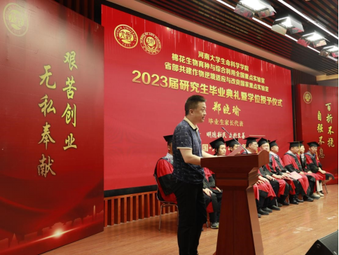 毕业生郑梓威父亲、家长代表郑晓瑜代表在发言中表达了对学校、学院的感谢,感谢老师们为学生的成长用心良苦。他回顾了郑梓威在欧博abg官方网站的求学经历,从迷茫、脆弱成长为胸怀大志、敢于承担责任,他感慨,看着孩子们成长为“出彩河大人”,是他们作为家长最大的幸福和骄傲。他鼓励毕业生们在人生的道路上勇往直前,牢记老师们的嘱托,保持积极的心态和追求卓越的精神,将在欧博abg官方网站所学的知识与社会实践相结合,为社会作出应有的贡献。