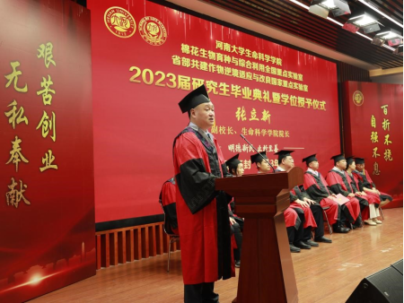 张立新代表学校和学院,向顺利完成学业的第六批“双一流”毕业生表示祝贺。他感谢同学们在求学期间对学校、学院各项工作的支持,回顾了在“双一流”建设过程中取得的丰硕成果,他强调这些成果与同学们的辛勤付出是密不可分的。他鼓励学生们,在“百年未有之大变局”的大环境下,秉持“明德新民 止于至善”的河大校训,在为中华民族伟大复兴奋斗的过程中实现个人价值,做一名有大格局的新时代卓越青年。
