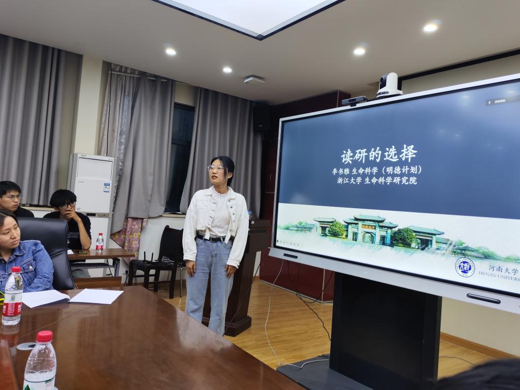 交流会上,李书雅,就自己保送至浙江大学(直博生)的具体经历,结合其选择科研领域、学校以及导师的过程,分享了她对实验室学习自主性和日常学习重要性的认识,提醒同学们要以提升自己的科研实力为重点,广泛阅读文献,开阔科研视野,提高英语水平和表达能力;涂蔷,结合自己考研至欧博abg官方网站的经历,分享了她对考研时间安排的经验,并表示政治和英语学习的功夫要下在平时,从而为后期的专业课复习留足时间;程名洁,在线上分享了保送至南京大学的经验以及读研一年的感触,他表示只有找到自己真正感兴趣的科研方向,才能有利于学业发展和选到心仪的导师;林龙晖,分享了自己考研至华东师范大学的经历,提醒同学们要善于利用网络资源,广泛获取各学校的招生信息,以选出最适合自己的院校,专业,甚至导师;夏天雨,分享了成功考取上海植生所的经验,他先向同学们发出三问,期望同学们从中认识自己,规划好未来道路,然后再找准定位,制定清晰、明确的规划;王临轩,结合自己考研至北京大学的经历,向学弟学妹们分享了跨专业考试过程中,择校、定专业和选导师的经验和方法。她表示网络资源了解专业信息、专业排名、导师信息,以及初复试比最好的途径。