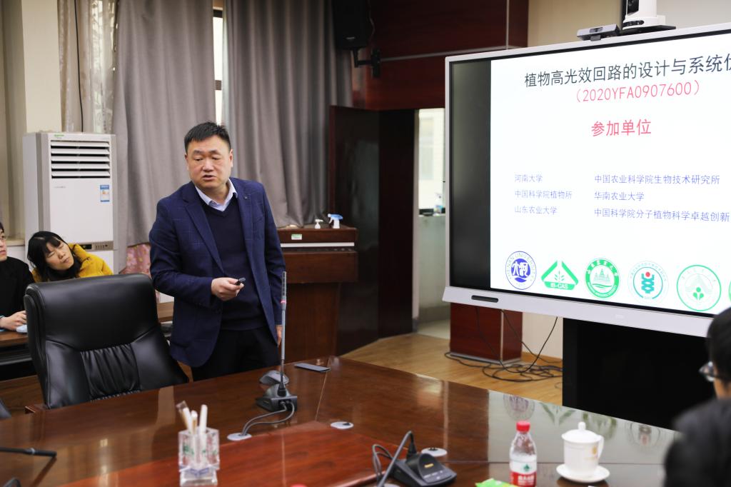 张立新首先介绍了项目执行的基本情况,他从光合作用、合成生物学、关键科学技术问题、总体研究目标、考核指标、中期执行情况等方面向大会作简要汇报。随后,项目下设课题、子课题负责人中国科学院植物所林荣呈教授、山东农业大学卢从明教授、中国农业科学院生物技术研究所张治国教授、张立新、华南农业大学彭新湘教授、中国科学院分子植物科学卓越创新中心朱新广研究员分别作“新型光能吸收和电子传递线路构建”、“光合作用高光逆境高效运行模块挖掘与重构”、“C4植物高光效调控网络与碳代谢回路优化”、“高光效C3植物底盘的设计及优化适配”、“新型高效固碳回路的设计和优化”、“高光效回路在C3植物光合底盘的组装与优化适配”的主题汇报,分别从主要研究内容、中期进展情况、亮点成果、下一步研究计划等方面进行了详细阐述。