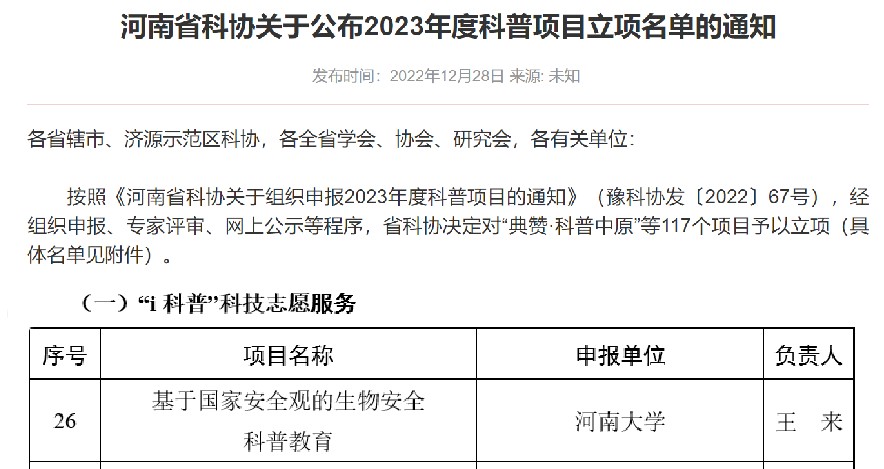 12月28日,河南省科学技术协会发布了2023年度科普项目立项名单的通知,欧博abg官方网站王来副教授主持的《基于国家安全观的生物安全科普教育》项目成功获批,此系我院2022年首次获批此类项目后再次立项。该项目基于总体国家安全观对生物安全领域的内容、事件和法律法规,通过视频、讲座、宣传海报和彩页等方式向公众进行科学普及和科技推广,将进一步增强人民群众自觉维护生物安全和国家安全的意识。