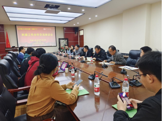 赵海鹏首先介绍了参会人员,并对戴树玺和张国伟一行的到来表示欢迎。接着向与会人员介绍了在学院对科普工作的重视下,科普工作开展情况和取得的成绩与社会认可度;尤其是围绕着黄河流域生态保护开展的系列科普活动和线上线下结合的做法,影响范围大、联合相关单位多,社会效应好,得到了与会人员的赞赏。