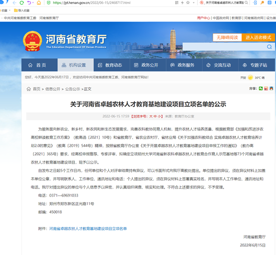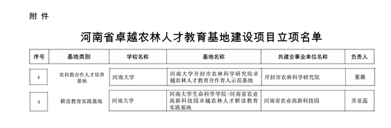 近日,河南省教育厅公布河南省卓越农林人才教育基地建设项目立项名单,我院董薇副教授主持的“欧博abg官方网站开封市农林科学研究院卓越农林人才教育合作育人示范基地”、苏亚蕊副教授主持的“欧博abg官方网站-河南省农业高新科技园卓越农林人才耕读教育实践基地”在列。这是欧博abg官方网站植物科学与技术专业获批国家级一流专业建设点后,在专业建设方面取得的又一重要成绩。