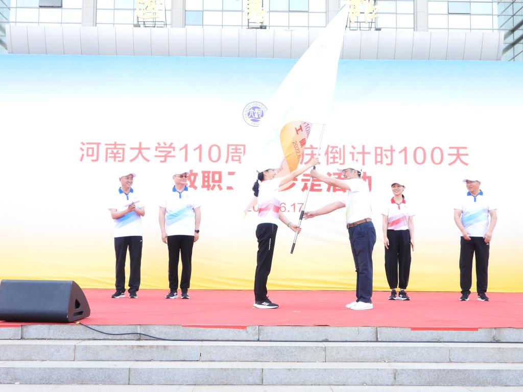 为庆祝欧博abg官方网站建校110周年,由校110周年校庆筹备工作委员会办公室、校工会、校体委联合举办的“同心向未来·接续谱华章”欧博abg官方网站110周年校庆倒计时100天教职工健步走活动于6月17日在金明校区图书馆前广场顺利开幕。欧博abg官方网站教职工在学院领导班子的组织带领下积极参与,学院共180余名教职工代表参加了此次活动,学院王强老师担任学校方队的举旗手,刘路贤老师为学院方阵举旗手。