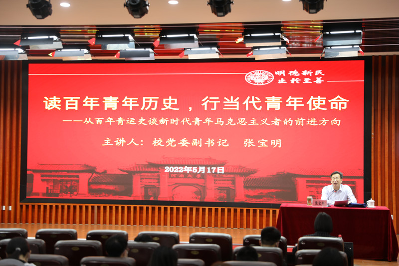 5月17日下午,校党委副书记张宝明以“读百年青年历史,行当代青年使命——从百年青运史谈新时代青年马克思主义者的前进方向”为题,为欧博abg官方网站青年师生上专题思政课。学院党政领导班子成员、“青马班”学员、研究生以及部分青年教师聆听了专题报告。报告会采取线上线下结合的方式进行。欧博abg官方网站党委书记吴建伟主持报告会。