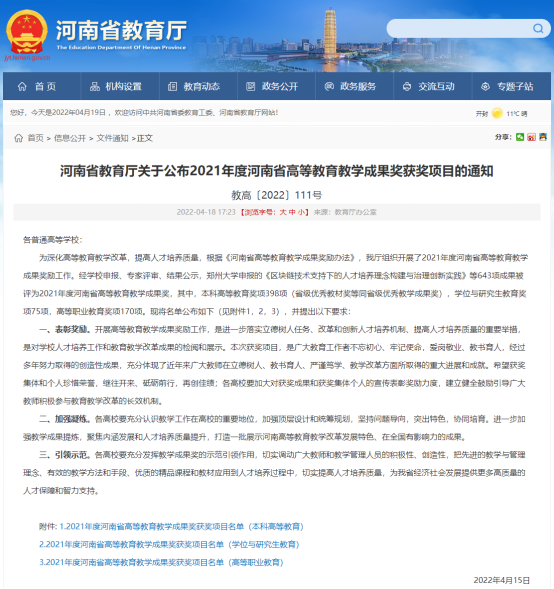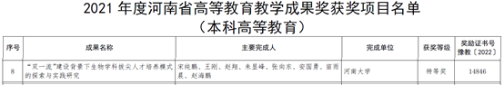 4月18日,河南省教育厅公布2021年度河南省高等教育教学成果奖获奖项目名单,宋纯鹏教授主持完成的“‘双一流’建设背景下生物学科拔尖人才培养模式的探索与实践研究”荣获特等奖。这是我院“基于科教协作‘菁英计划’的地方高校拔尖创新人才培养模式研究与实践”项目获2019年度河南省高等教育教学成果特等奖之后,在拔尖人才培养方面取得的又一重要成果。项目实施与组织申报得到了学校有关领导、教务处等部门的悉心指导和大力支持。