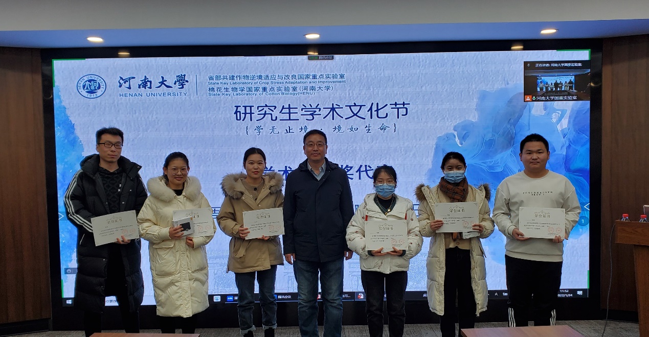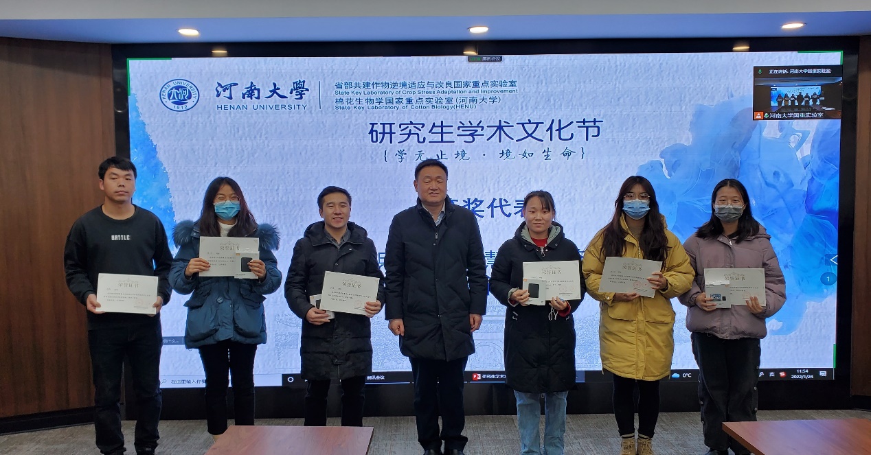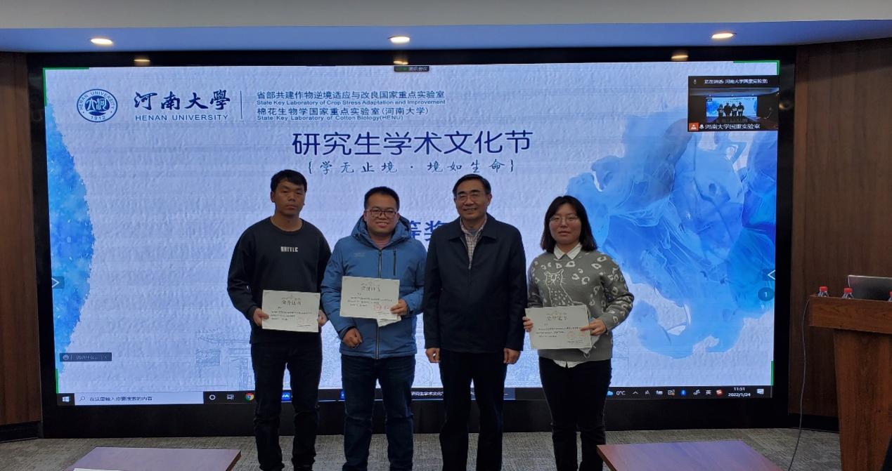 1月24日上午,欧博abg官方网站国家重点实验室2021年研究生学术文化节颁奖仪式在省部共建作物逆境适应与改良国家重点实验室一楼会议室召开。校长、省部共建作物逆境适应与改良国家重点实验室主任宋纯鹏教授,副校长王学路教授,副校长、欧博abg官方网站院长张立新教授,欧博abg官方网站党委书记吴建伟,农学院党委书记王磊,农学院执行院长王道杰,省部共建作物逆境适应与改良国家重点实验室、棉花生物学国家重点实验室主要领导,国家重点实验室部分研究生导师及获奖学生代表出席颁奖仪式,颁奖仪式由欧博abg官方网站棉花生物学国家重点实验室副主任赵翔主持。