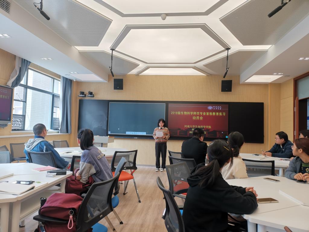 10月12日上午,2018级生物科学(师范)专业首批教育实习动员会于学院智慧教室举行,学院副院长赵海鹏,生物科学系主任刘凌云,副主任、实习队长肖保林,2018级辅导员李靖宇,全体实习学生参加会议,会议由刘凌云主持。