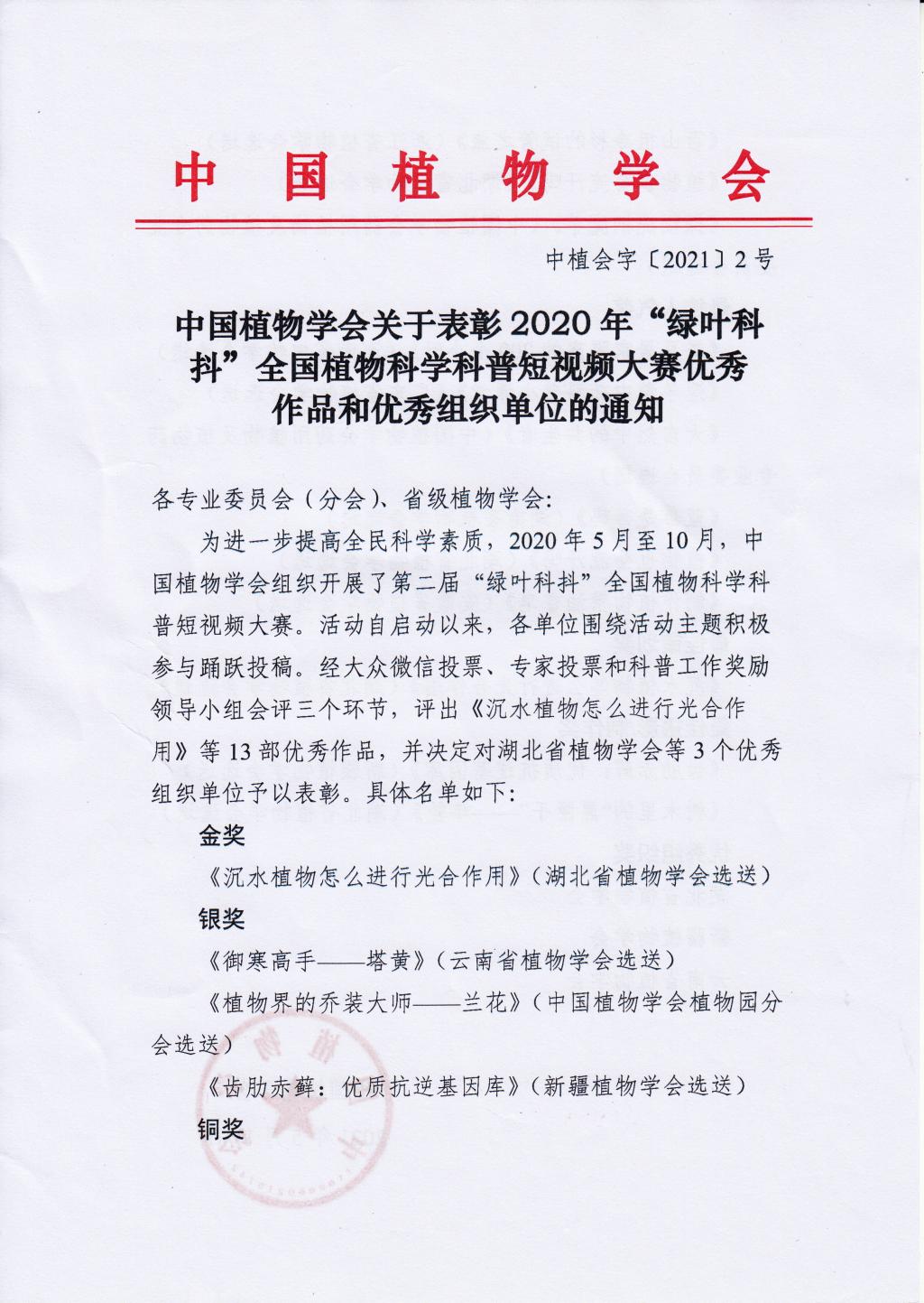 为普及科学知识,关注社会生活重点热点,提升环境保护意识,提高全民科学素质,助力公众科学理解国家绿色可持续发展的重大布局,中国植物学会联合各专业委员会(分会)、省级植物学会于2020年举办了“第二届全国植物科学短视频大赛”。大赛共分为征集(2020年5月-2020年9月)、评选展示(2020年10月-2020年12月)以及颁奖活动(2021年省级理事长联席会上表彰)三个阶段。