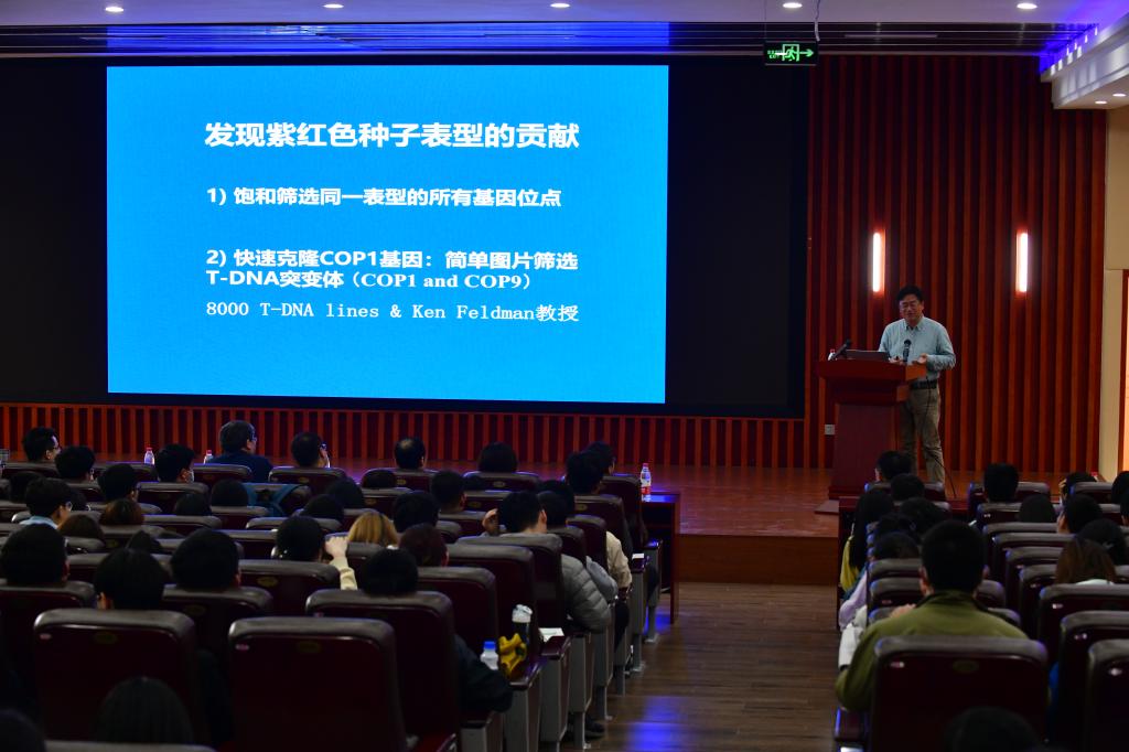4月26日下午,欧博abg官方网站在圆形报告厅举行第18期“卓越生科沙龙”讲座,邀请美国国家科学院院士、北京大学现代农学院学术委员会主任邓兴旺院士主讲。邓院士以《光调控植物生长发育机理》为主题,为欧博abg官方网站师生带来了一场精彩的知识盛宴。报告会由学院院长张立新教授主持,欧博官网校长宋纯鹏教授以及学院青年教师、本科生、研究生近400人参加活动。
