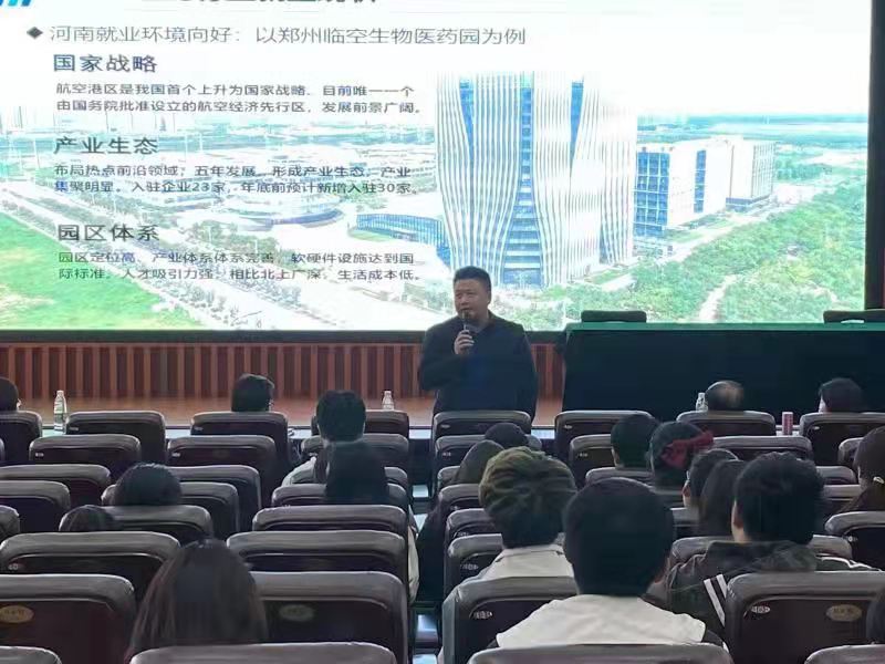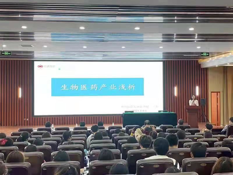 校外实习指导教师代表、郑州临空生物医药园负责人马兵为在座的同学们做了题目为“生物医药产业浅析”的学术报告。主要介绍了生物医药行业国内外的发展概要,以及生物医药国内的竞争格局,并针对生物医药就业现状进行分析。