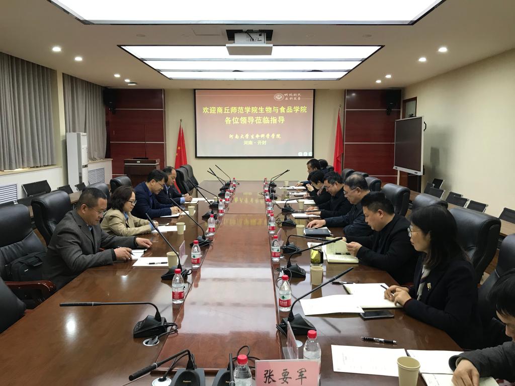 4月2日上午,商丘师范学院生物与食品学院院长周庆峰、党委副书记史继红、副院长裴冬丽、副院长韩进诚一行来我院交流,欧博abg官方网站党委书记赵东保、执行院长王刚、党委副书记张亚歌、副院长王道杰、副院长赵海鹏、生物科学系主任刘凌云、副主任肖保林、教师代表张彤等参加交流座谈会。会议由王刚主持。