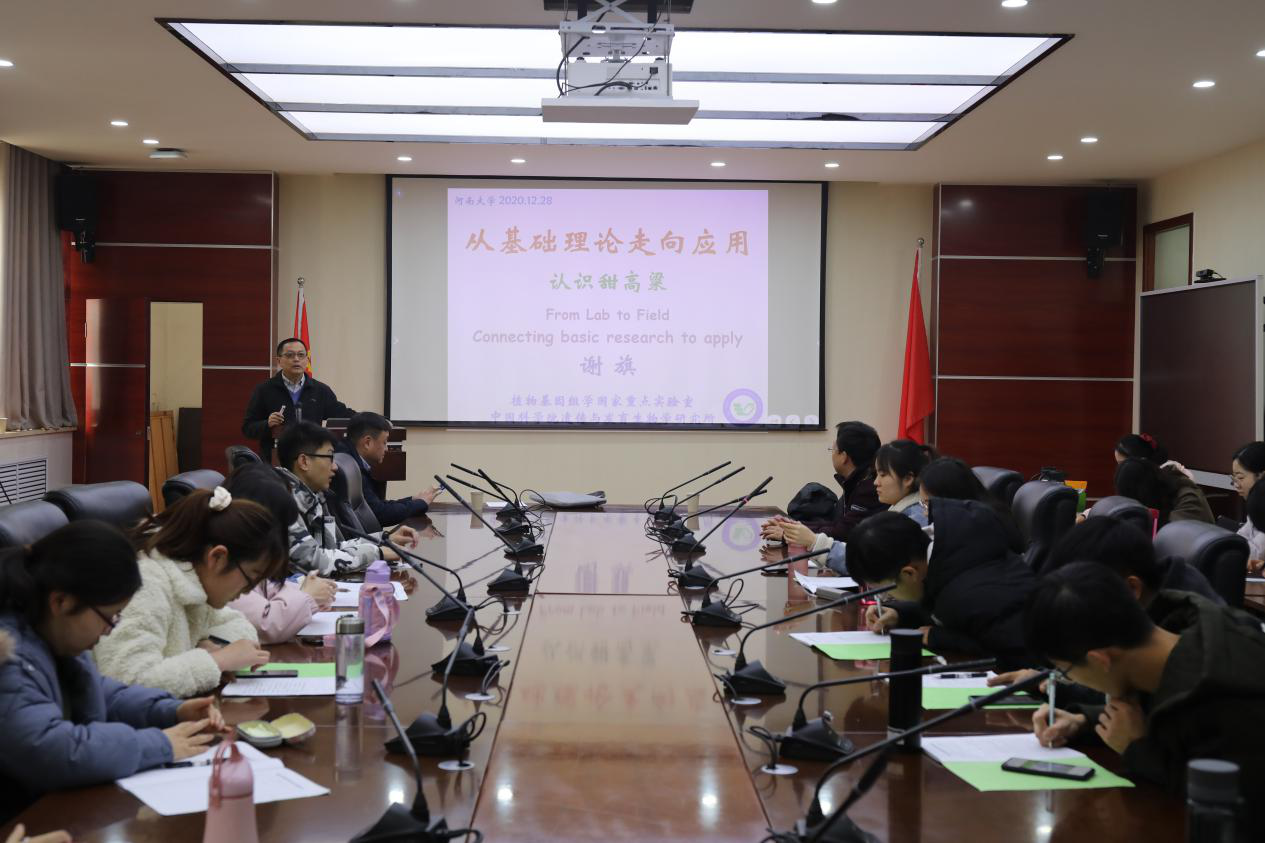 2020年12月28日上午,总第175期、2020年第13期“生物学前沿学术交流研讨会”(Biology cutting-edge Academic Exchange Seminar,简称“BAES”)在生科院B201举行。中科院遗传与发育研究所,特聘教授,国家杰出青年基金获得者谢旗应邀在此作题为“从基础理论走向应用-认识甜高粱”的学术报告。来自欧博abg官方网站生物学的研究生聆听了报告。报告会由张立新老师主持。
