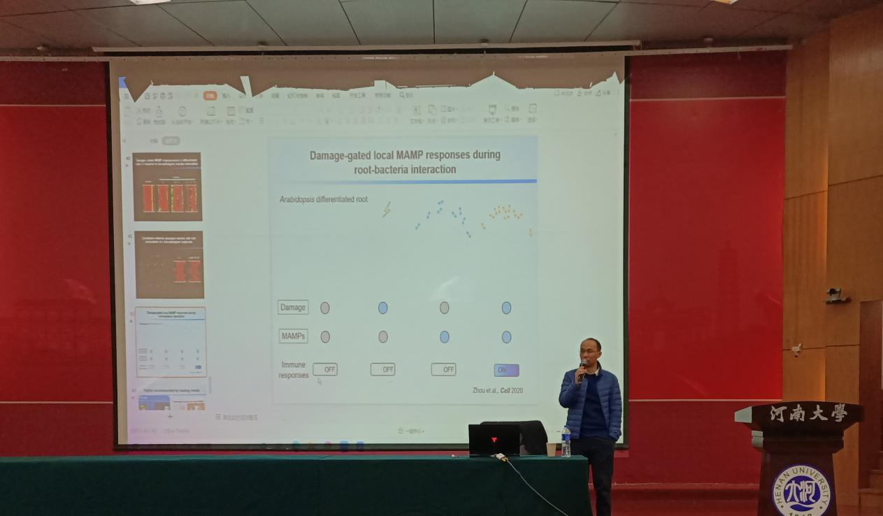 周峰以植物发育的偶然性和必然性、生长方式的起源、植物的总形态、分支的形成、营养到生殖的转换、株型的“分子设计”和总结与展望为提纲对本次报告做了详细叙述。期间还向同学们展示了一些实验图片,提升大家对实验的兴趣。报告结束后,问答环节,同学们踊跃提出自己的疑问,周峰也耐心作答。
