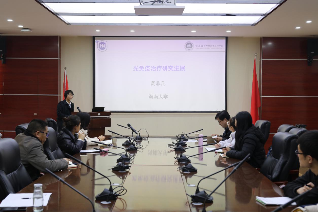 2020年12月7日上午,2020年第9期,总第171期 “生物学前沿学术交流研讨会”(Biology cutting-edge Academic Exchange Seminar,简称“BAES”)欧博abg官方网站研究生院组织的学术报告在欧博abg官方网站B201举行。海南大学生物医学工程学院周非凡教授在此作题为“肿瘤光免疫治疗研究进展”的学术报告。来自欧博abg官方网站生物学专业的全体研究生出席了报告会。会议由欧博abg官方网站副院长赵翔主持。