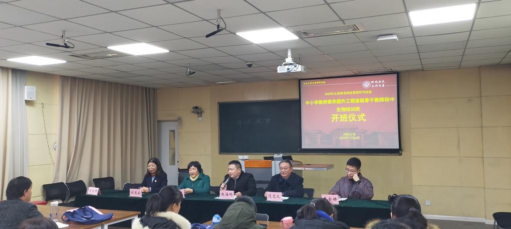2020年12月6日,2020年义务教育师资薄弱环节改善中小学教师素养提升工程省级骨干教师初中生物学培训班开班仪式在欧博abg官方网站举行,来自全省各地的培训班学员50名,学院副院长赵海鹏、成人教育办公室主任李黎、生物科学系主任刘凌云、培训班课程安排负责人闫文义等出席开班仪式,仪式由闫文义主持。