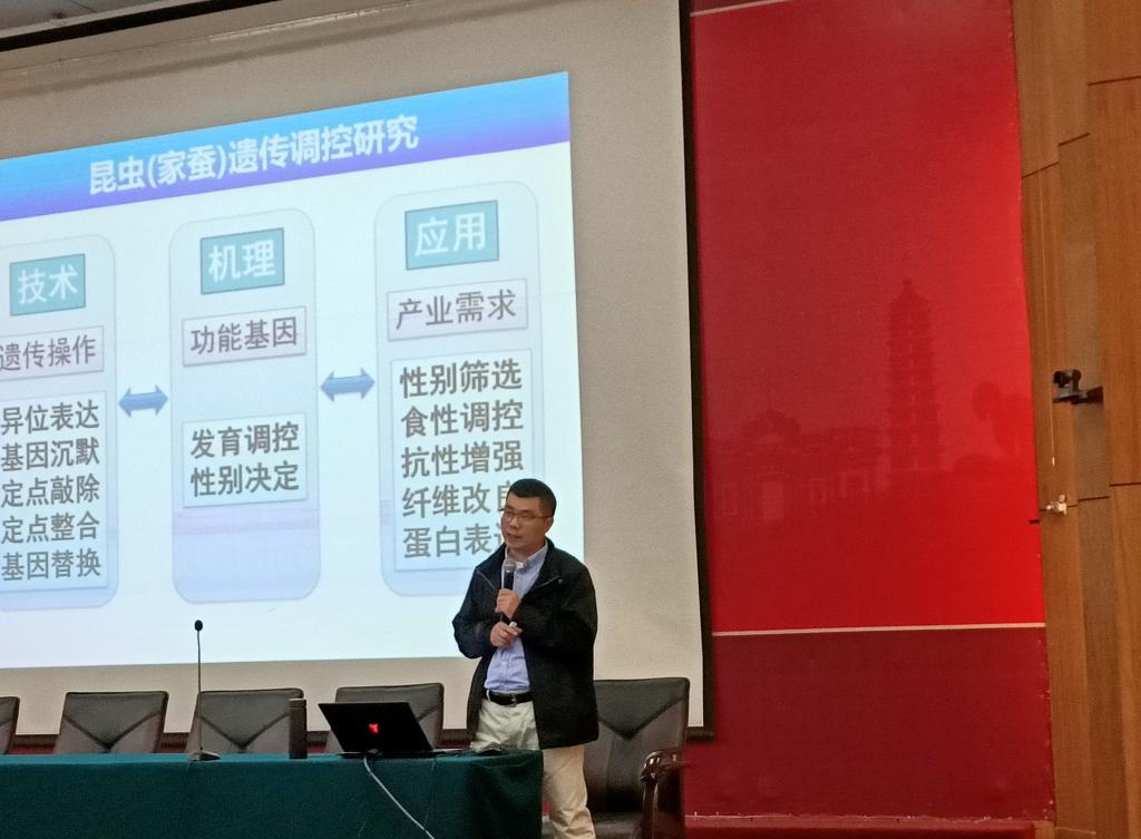 谭安江教授分别从昆虫遗传调控和昆虫转基因原理两方面展开详细讲述。他逐一介绍了昆虫遗传操作平台:转基因、基因沉默、基因敲除、基因敲入的实验过程。接着讲解了昆虫转基因的原理、方法、操作以及应用。谭安江教授讲到:“通过我们前期的基础科学研究,有助于为安全高效的害虫生物防治、虫媒疾病的防控提供理论基础。”报告会结束以后,同学们积极提问,谭安江教授也一一作答,学术氛围十分浓厚。