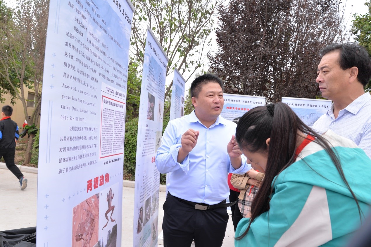 九点二十分,在刘庄小学校长张伟主持下,科普活动正式开始。赵海鹏与开封市野生动物保护站站长朱磊共同为欧博abg官方网站野外实习基地揭牌。刘庄小学学生代表上台领取了以保护野生动物为主题的精美礼品。紧接着,老师和学生们有序涌向科普宣传区。图文并茂的宣传材料、栩栩如生的标本图片深深的吸引了求知若渴的小学生们。他们纷纷提问,你一言我一语,气氛非常热烈。带队老师和科普队员们详细的向小学生们耐心讲解,解答了他们的疑惑。