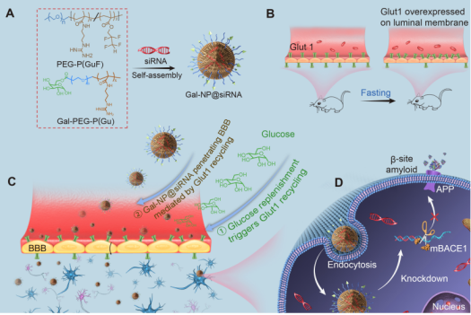 阿尔茨海默症(俗称老年痴呆症)是一种常见的神经退行性疾病,严重威胁着人类的健康。在阿尔茨海默症中,β淀粉样蛋白的积累被公认为关键的致病因素之一,而β淀粉样前体蛋白(APP)则由β分泌酶 1(BACE1)和γ-分泌酶水解而产生。小干扰RNA(siRNA)通过特异性沉默BACE1具有治疗阿尔茨海默症的良好前景,然而也面临裸siRNA易被降解及代谢,以及由于血脑屏障(BBB)的阻碍,难以在脑部有效积累等一些挑战,缺少有效的递送方法限制了siRNA的应用。
