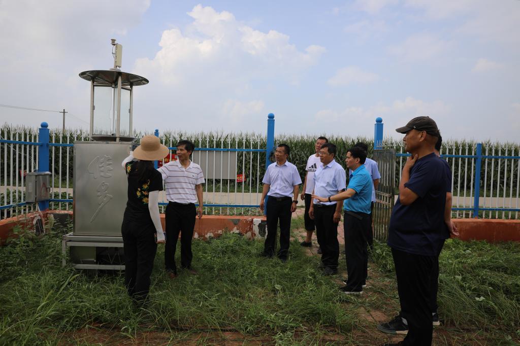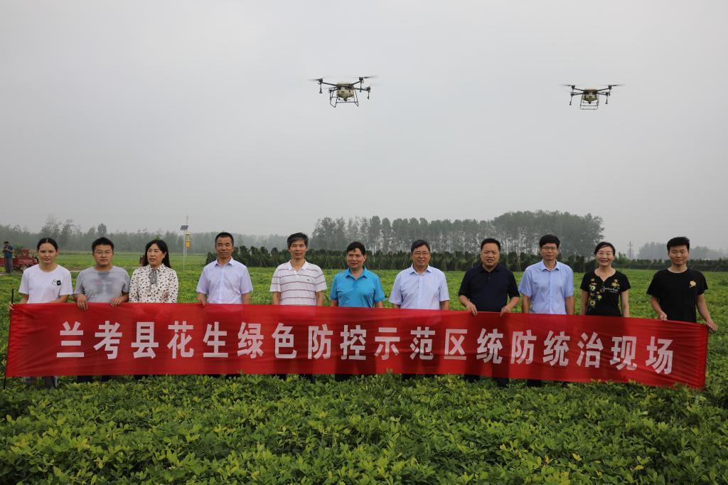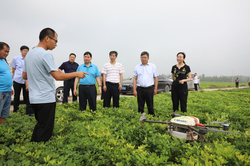 在兰考县花生病虫害绿色防控示范区,兰考县农业农村局副局长朱卫东,兰考县植保站站长徐竹莲等人向考察组介绍了示范区工作运行体制,开展以生态治理、农业防治、生物防治和理化诱控技术为主的绿色防控技术体系示范与推广,有效、经济、安全地防控病虫灾害,促进兰考县农业增效、农民增收和农业生态建设。考察组实地参观了频振式杀虫灯、性诱剂诱杀成虫技术等应用场景,并查看了机防队使用无人机进行农药喷洒作业等工作。