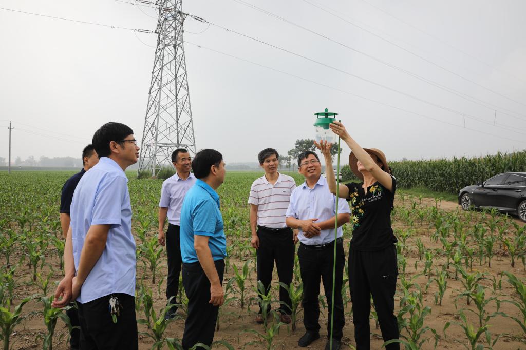 在周口市淮阳区玉米病虫害绿色防控示范区,周口市植保植检站站长张东良、周口市淮阳区植保植检站站长马巍等人向考察组重点介绍了农作物生物防治、化学防治技术,通过使用生物制剂白僵菌、阿维菌素防治地下害虫,宁南霉素防治结线虫、多抗霉素防治枯萎病等技术方法。