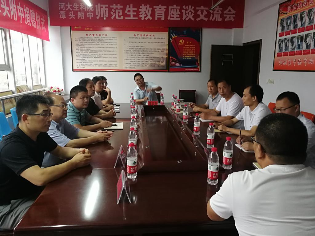 8月1日下午,欧博abg官方网站与河大潭头附中师范生教育座谈会在欧博abg官方网站潭头附属中学(以下简称潭头附中)会议室举行。潭头附中校长党义涛,副校长马海军、后勤主任陈根生、教师代表宇小河、薛松艳;我院副院长赵海鹏,生物科学系主任刘凌云、实验教学中心主任李世朋、教师代表李锁平、杨生玉、李黎老师参加了座谈。座谈会由党义涛主持。