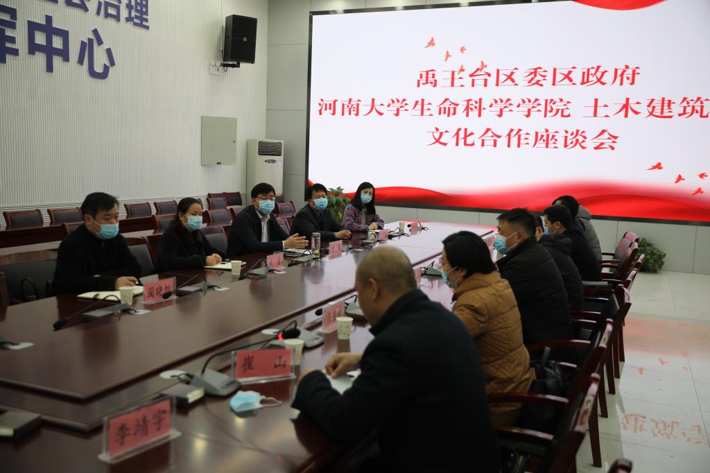 4月10日上午,欧博abg官方网站党委书记赵东保、院长张立新一行赴开封市禹王台区召开文化合作座谈会。开封市禹王台区区委书记黄腾,区委常委、区委宣传部长郑华腾,副区长杜君,区文化旅游局局长李慧莉,区文化馆馆长蔺晓旭参加座谈,学院党委副书记张亚歌、副院长王道杰参加会议。会议还邀请了土木建筑学院院长岳建伟、禹王台公园主任崔山、开封文化历史规划建筑界专家宋安平参加。会议由郑华腾主持。