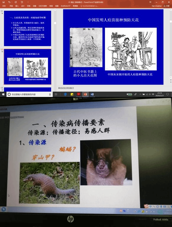 2月17 日下午,田兴华老师通过“雨课堂”与PPT结合在线视频的方式为2017级生物科学专业学生讲授《免疫学》,结合当前疫情防控,讲解了天花病毒及鼠疫病毒流行期间,人类与传染性疾病抗争的过程和采取的措施,让同学们充分了解了人类与传染病斗争并取得胜利的历史事实,交流互动热烈,通过“隔离传染源、切断传播途径、保护易感人群”等传染病防治的原则的讲解,让同学们更加认识到党和国家对本次新型冠状病毒肺炎疫情防控的部署决策是科学合理、符合规范的,进而增强抗击疫情的信心,提高了政治站位。结合免疫学与其它学科交叉融合的新发现,人类的免疫系统与内分泌系统、神经系统存在互作,愉快的情绪能够提高个体的免疫力等内容讲解,引导大家在疫情期间学会调节生活节奏,保持良好的情绪,增强免疫力,以健康的身心迎接这场战役的胜利。课后,针对同学提出的嗓子疼、食欲变差等问题,进行了针对性的答疑,建议同学们在家中利用现有条件进行适度锻炼、适量饮水、注意卫生,用健康的生活方式进行应对。整堂课,同学们情绪饱满,互动频繁,感觉免疫学既有趣又有用。