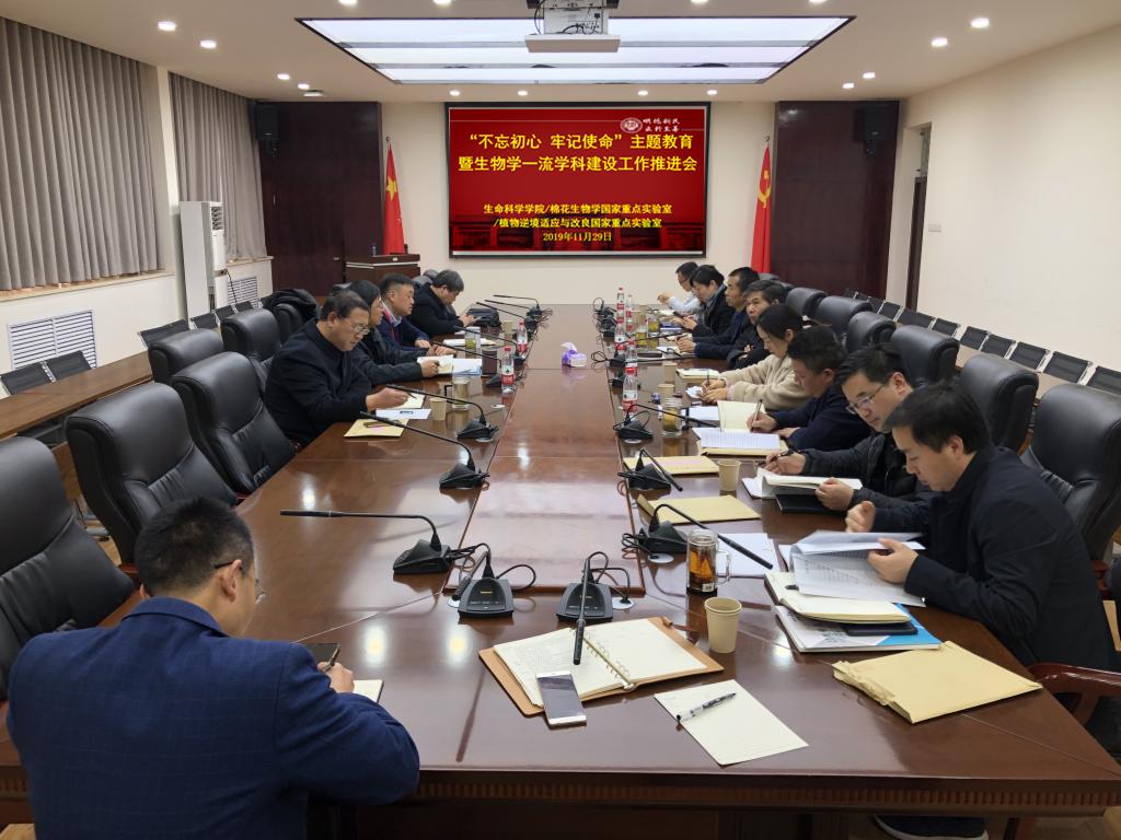 11月29日上午,欧博abg官方网站党委在学院B201会议室召开“不忘初心、牢记使命”主题教育专题研讨暨生物学一流学科建设工作推进会,欧博abg官方网站、棉花生物学国家重点实验室以及植物逆境适应与改良国家重点实验室全体领导班子成员参加会议。会议由学院党委书记赵东保主持。