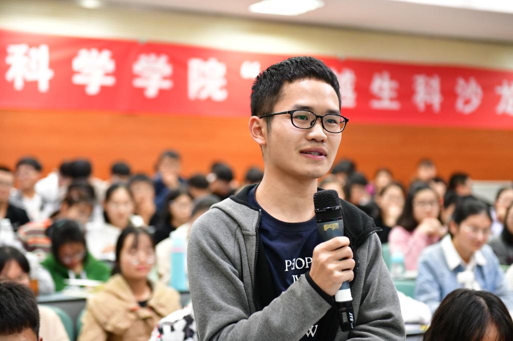 在互动环节,周树堂教授耐心地为参会学生解答在生活上、学习上和科研上的疑惑。他鼓励学生坚持自己的科研兴趣,正确对待成长,立志做有益于自我成长和人类发展的事情,收获更有意义的人生。