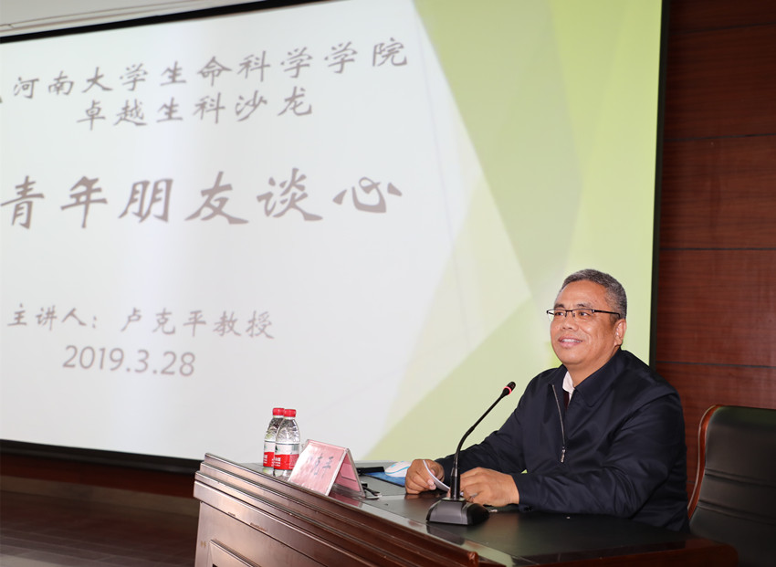 卢克平亲切回忆起自己生活的时代,并指出当代青年生活在一个美好的时代,一个知识备受重视的时代,一个前瞻开放的时代,青年师生们拥有广阔天地,可以大有作为。“天下之本在国,国之本在家,家之本在身。”卢克平结合自身学习、工作的经历,与青年师生谈心,他建议青年师生向中国知识分子学习,他从追求永恒、心系天下、忧患意识、通达情理等方面讲述中国知识分子的“家国情怀”。谈到心系天下时,他指出:“正如今天我们讲人类命运共同体,我们不是只关注中国人的命运,而是全世界的人类命运共同体,这就是心怀天下的远大抱负。”他告诫青年师生,要通达情理,首先要学会自爱,只有先自爱,才能爱人。“自古以来,中国青年知识分子总是走在时代前端,在他们心里,价值排序应为先天理人情,再依法规治。”卢克平号召河大学子,既要继承悠悠千年风骨底蕴的精华,又要学会融会贯通新时代的先进思想,做一个勇于奉献、敢于担当、在危难中为民族、为国家做出贡献的知识分子。