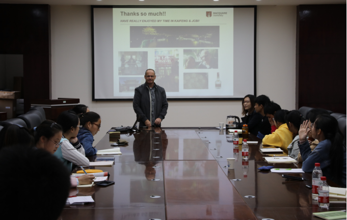 座谈会上,Lovejoy博士用简明轻快的形式向同学们介绍了澳大利亚的人文、麦考瑞大学、自己的科研经历和最新的研究成果,并表达了对中国文化和开封古城的喜爱。在互动环节,明德班同学和Lovejoy博士就如何平衡科研和生活的关系、科研成果的转化和应用、癌症和阿尔茨海默氏病的日常预防等问题进行了热烈讨论,并对“科学就是探索未知世界”这句话有了更深的理解。座谈会现场气氛活跃,同学们参与度高,形式别开生面。同学们不仅能突破语言障碍,还能表达个性化思考,提出颇有深度的问题与见解。