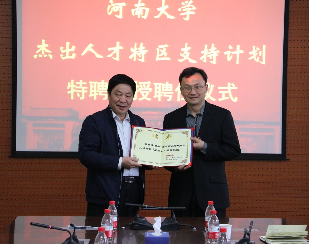 杨中华为“杰出人才特区支持计划”第二层次特聘教授杨明(右)颁发聘书