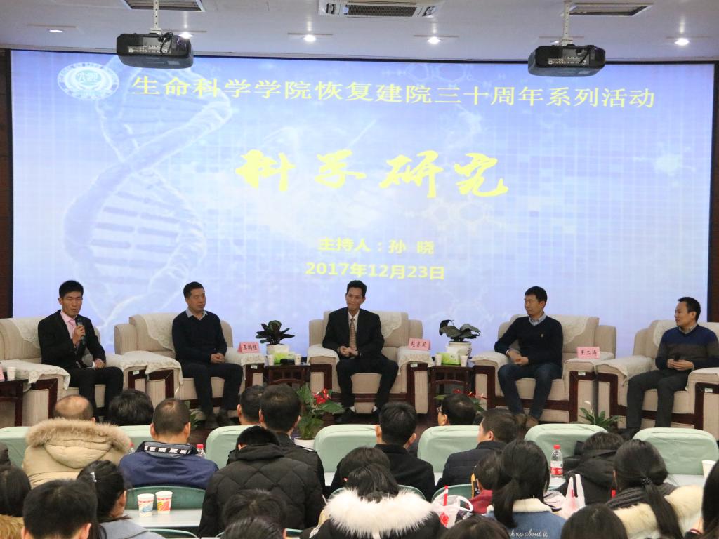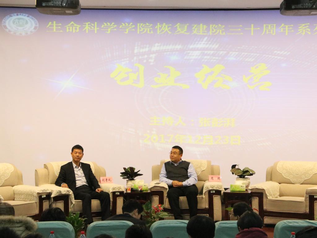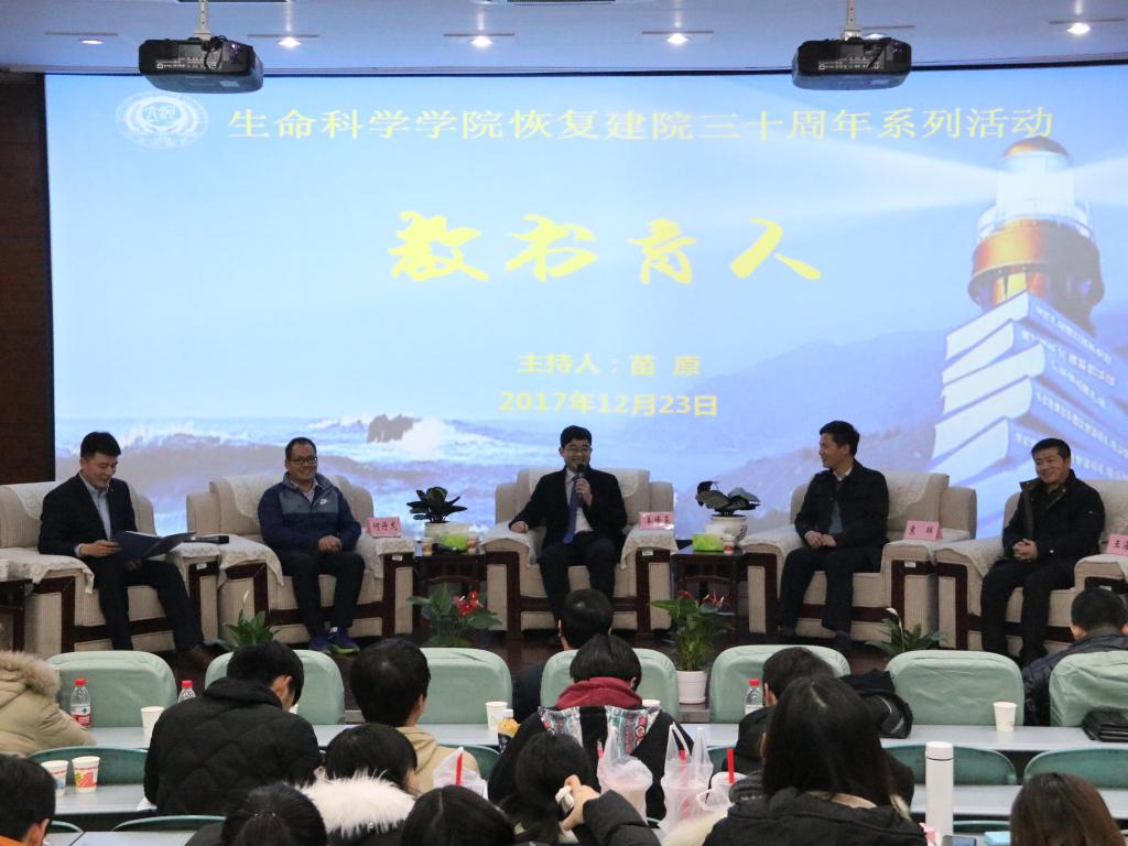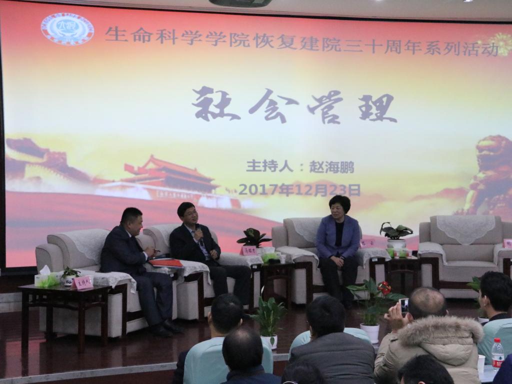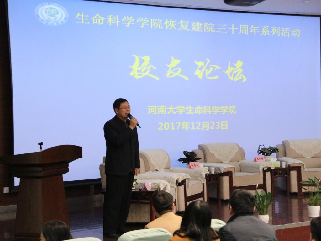 随后论坛开始,本次论坛分为科学研究、社会管理、教书育人、创业经营四个板块。我院青年教师孙晓、赵海鹏、苗原、张彭湃分别担任四个板块的主持人。首先是科学研究板块,1988级校友、国家杰青、中国农业大学特聘教授赵要风提出在科研道路上要深入对待自己的课题,潜心研究;1996级校友王鹏程向大家讲述了他的河大求学和工作经历,分享了他的人生感悟,教育学生要对自己的人生有清楚的规划,向着自己的目标前行;1999级校友、中科院上海植物生理生态研究所研究员王二涛告诫大家在科研上要有质疑科学权威的勇气;2001级校友中科院天津工业生物技术研究所研究员孙周通教育学子们要怀着一颗感恩的心去做事做人。