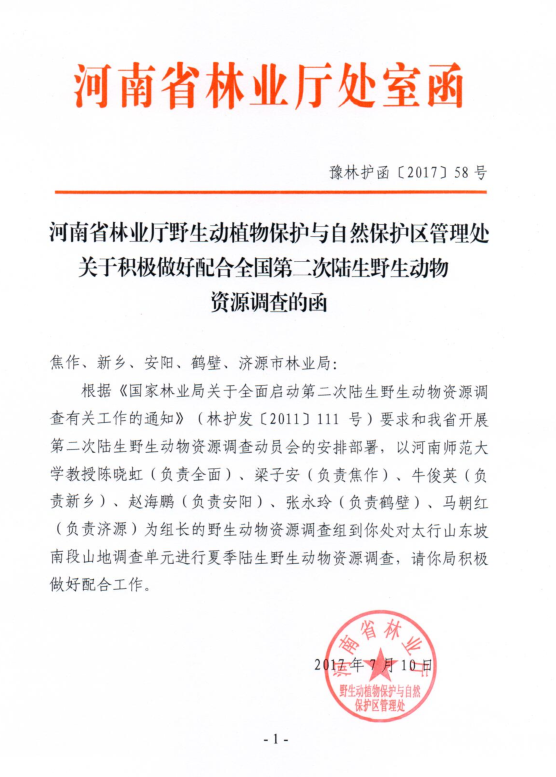 应河南省林业厅野生动植物保护和自然保护区管理处邀请,我院教师赵海鹏博士赴太行山以安阳样区负责人身份开展夏季陆生脊椎动物资源调查工作,调查时间为2017年7月6日至11日,已顺利完成既定任务并安全返校。