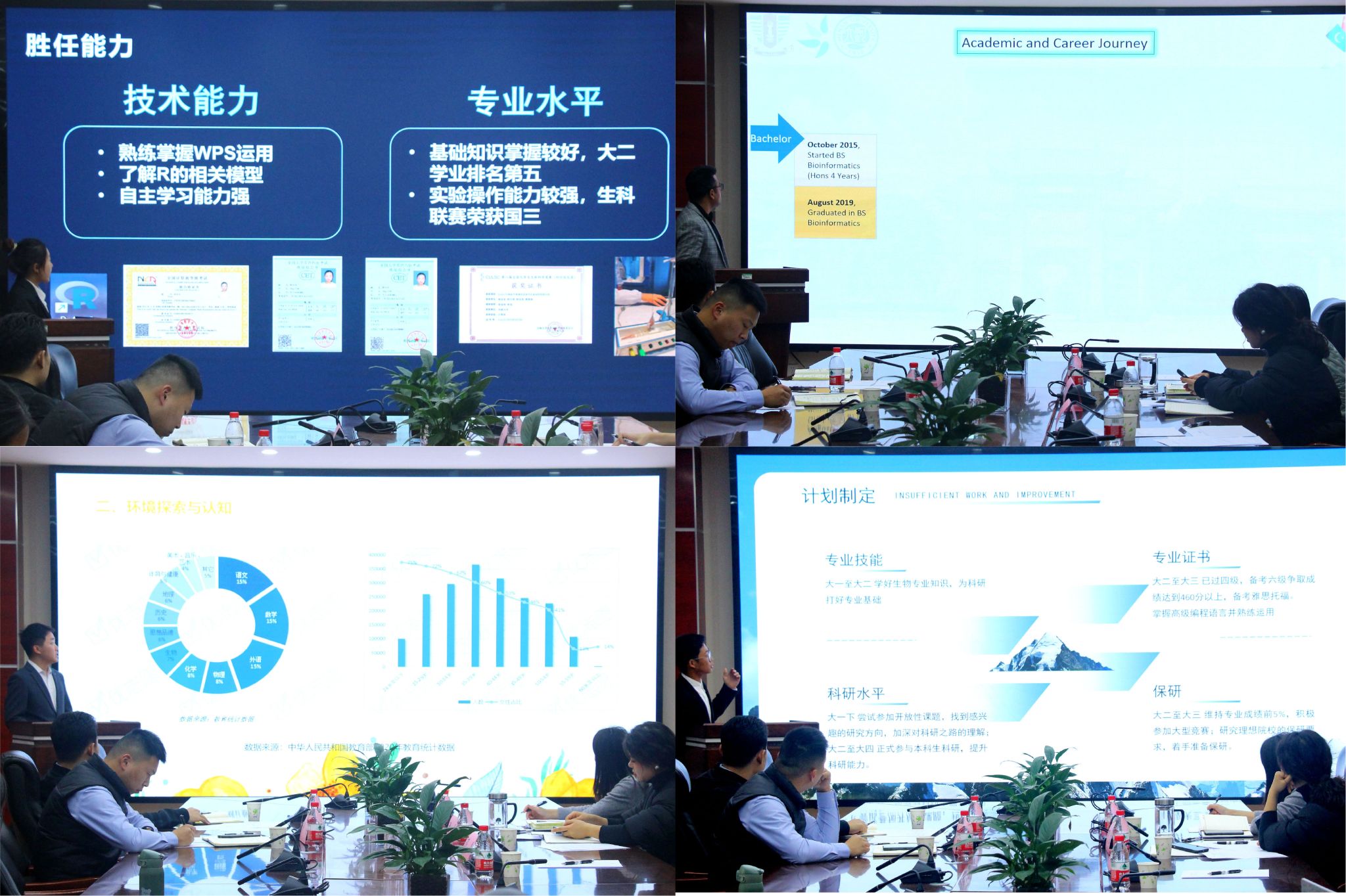 欧博abg官方网站大学生职业规划大赛分为成长赛道、就业赛道,共有400余名本、硕、博及留学生参赛,经过生涯发展报告、生涯发展PPT文稿等初赛评审,最终评选成长赛道24人、就业赛道23人参加院级决赛。在决赛个人展示环节,选手们从个人分析、职业认知、发展规划与路径实施、评估调整等几个方面对自己的职业规划和就业展望进行全面展示,汇报自身成长与实践经历,突出了契合时代要求、发挥个人特长的职业目标。各位选手“不驰于空想,不骛于虚声”,将个人理想与生活现实有机结合,有希望成为乡村教师,奉献一方教育者;有计划成为专家教授,勇攀科学高峰者;有立志成为科普宣传员,传播生物科学文化。选手们的精彩表现引得现场阵阵掌声,尤其是巴基斯坦籍博士留学生Roshan的精彩展示更是将比赛推向高潮,充分展现了生物学科国际化人才培养的平台优势。
