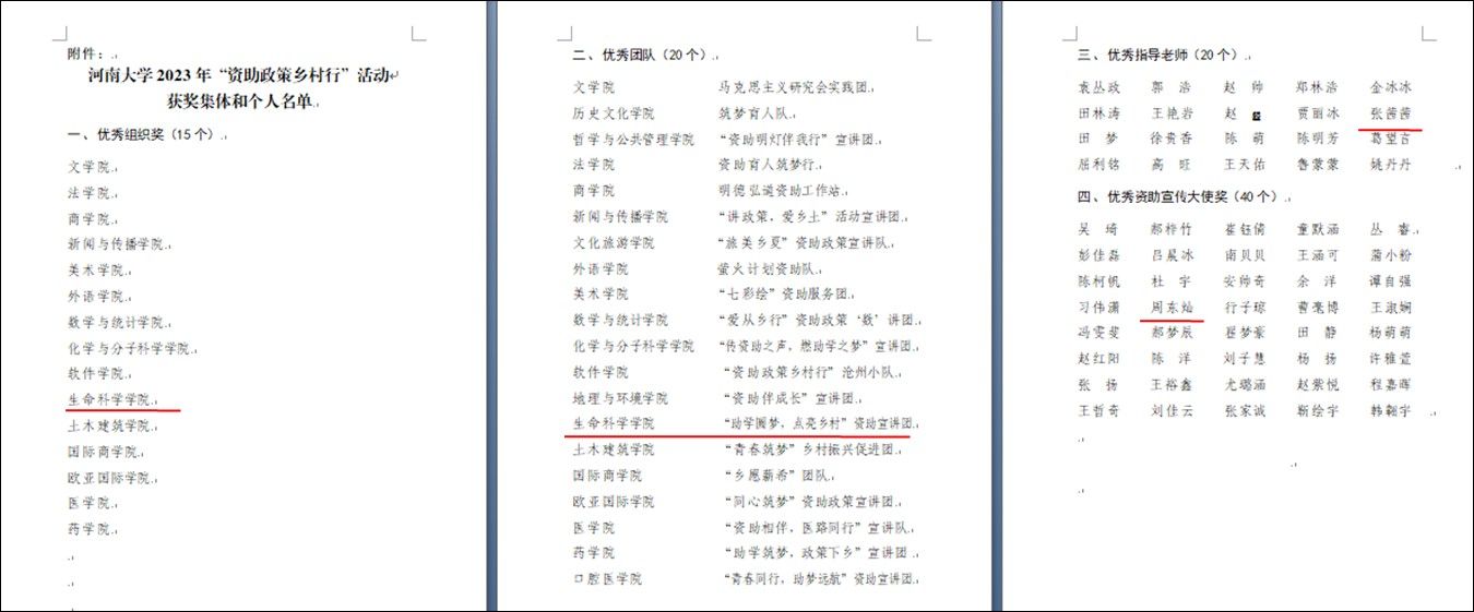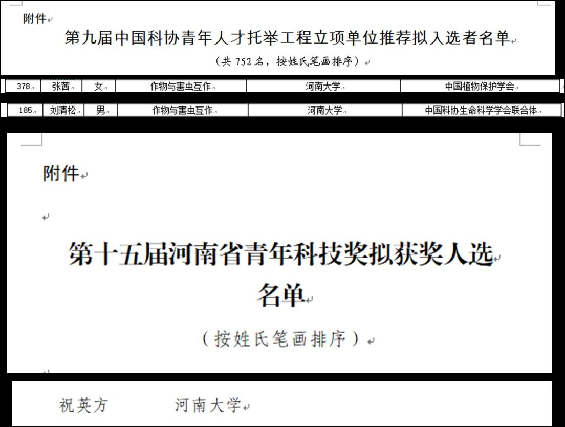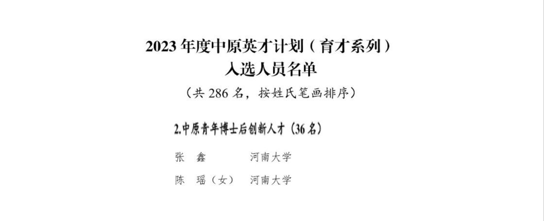近日,中国科协公布了第九届“青年人才托举工程”入选者名单,青年教师张茜和刘清松入选;河南省科协公布了第十五届河南省青年科技奖获奖人选名单,青年教师祝英方入选;中共河南省委人才工作领导小组办公室发布了2023年度“中原英才计划(育才系列)”拟入选人员公示名单,张鑫、陈瑶入选中原青年博士后创新人才。