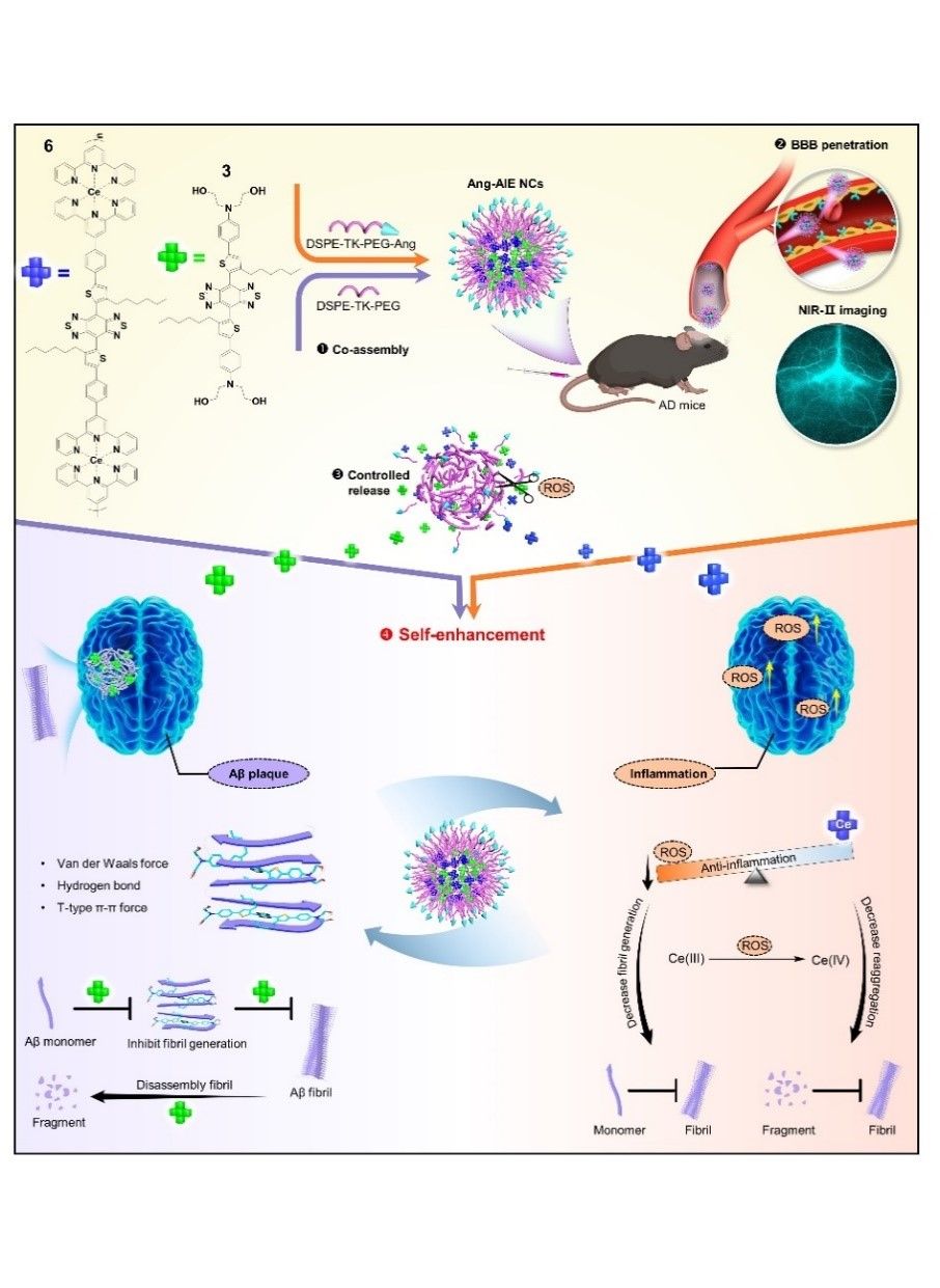 河南省脑靶向生物纳米药物重点实验室团队围绕AD疾病,构建了一种具有活性氧(ROS)响应的近红外脑靶向聚集诱导发光(AIE)纳米诊疗剂用于AD诊疗。研究结果以“A one-two punch targeting reactive oxygen species and fibril for rescuing Alzheimer’s disease”为题发表在Nature Communications(中科院一区SCI-TOP期刊,IF = 16.6)(欧博abg官方网站王杰菲副教授和博士研究生上官萍为共同第一作者,香港中文大学唐本忠院士、欧博abg官方网站冰洋教授和汪欣副教授、南方医科大学南方医院张静教授为共同通讯作者)。