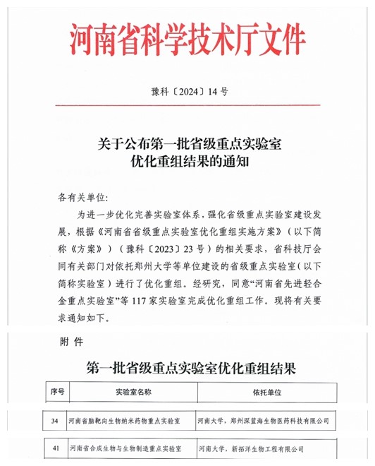 1月26日,河南省科学技术厅下发《关于公布第一批省级重点实验室优化重组结果的通知》(豫科[2024]14号),依托学院成立的河南省脑靶向生物纳米药物重点实验室、河南省合成生物与生物制造重点实验室完成优化重组工作。