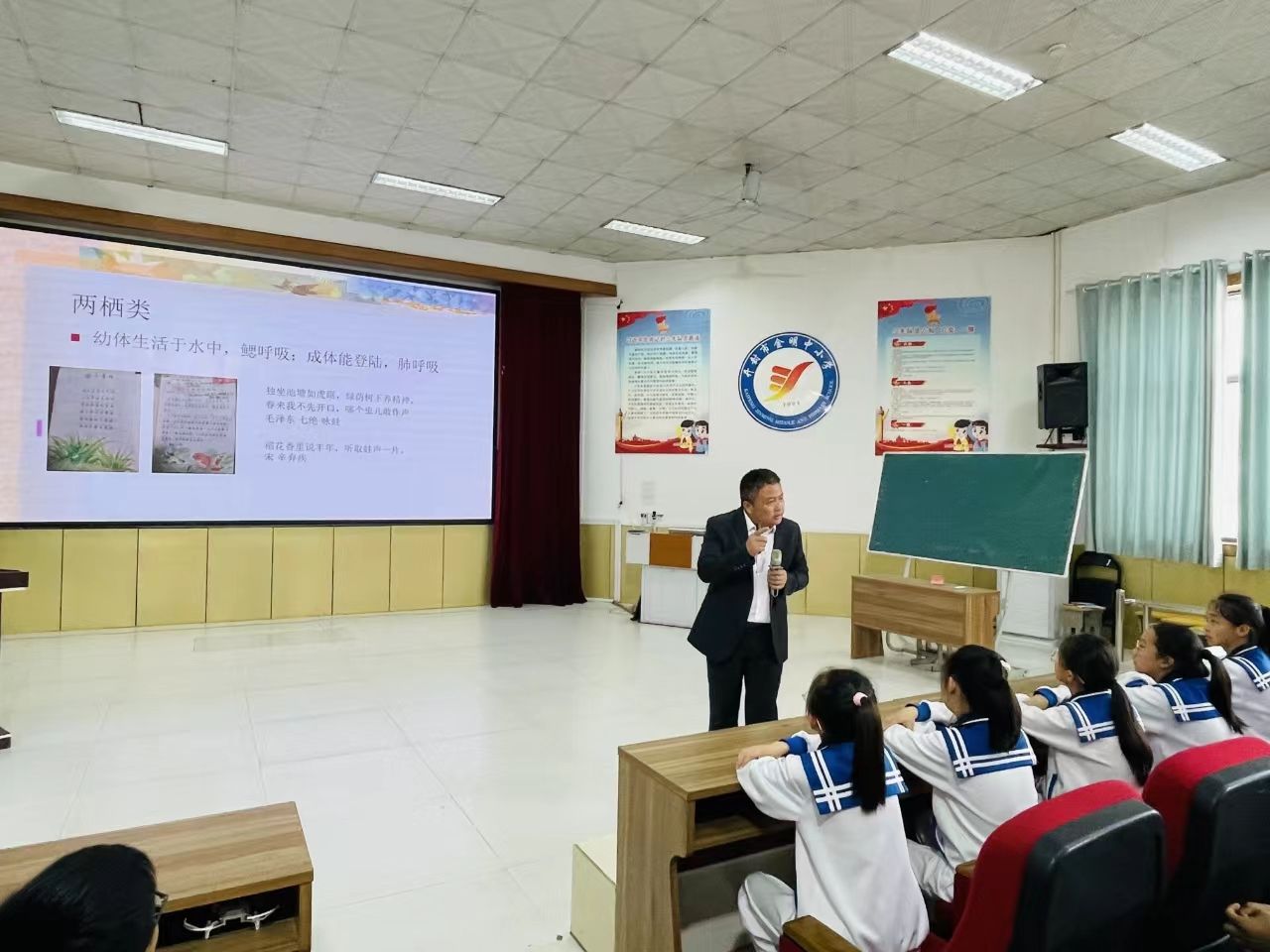 5月6日,2024年河南省科技活动周之际,我院赵海鹏教授应邀参加金明中小学“科学嘉年华”开幕式并受聘担任该校科技副校长。随后,赵海鹏为该校师生做了题为“中小学语文里的动物学知识----兼谈黄河开封段常见动物”的科普讲座。讲座涉及两栖类、爬行类、鸟类、哺乳类和昆虫类等多个动物类别,结合语文课本里出现的动物和黄河开封段动物资源进行了生动的讲解,使学生们更加了解周边生物多样性,增强了生态保护的认识,也体会到了学习、获取知识的趣味,增强了对大自然的好奇心。